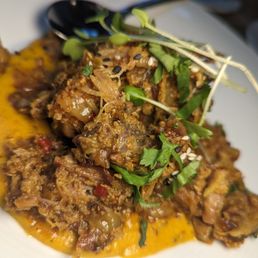 The restaurant has a relaxing , classy vibe both indoors and out. Outside has a covered area surronded with greenery. The vegetable samosa had a satisfying strong seasoning that was balanced. The grilled broccoli had a complex taste that was delicious. The garam masala goat was prepared perfectly, tender full of flavor. The chicken Tikka masala was good, but I have definitely had much better.